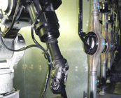 溶接ロボットにより、ハウジング本体にブラケット類が溶接されます。
